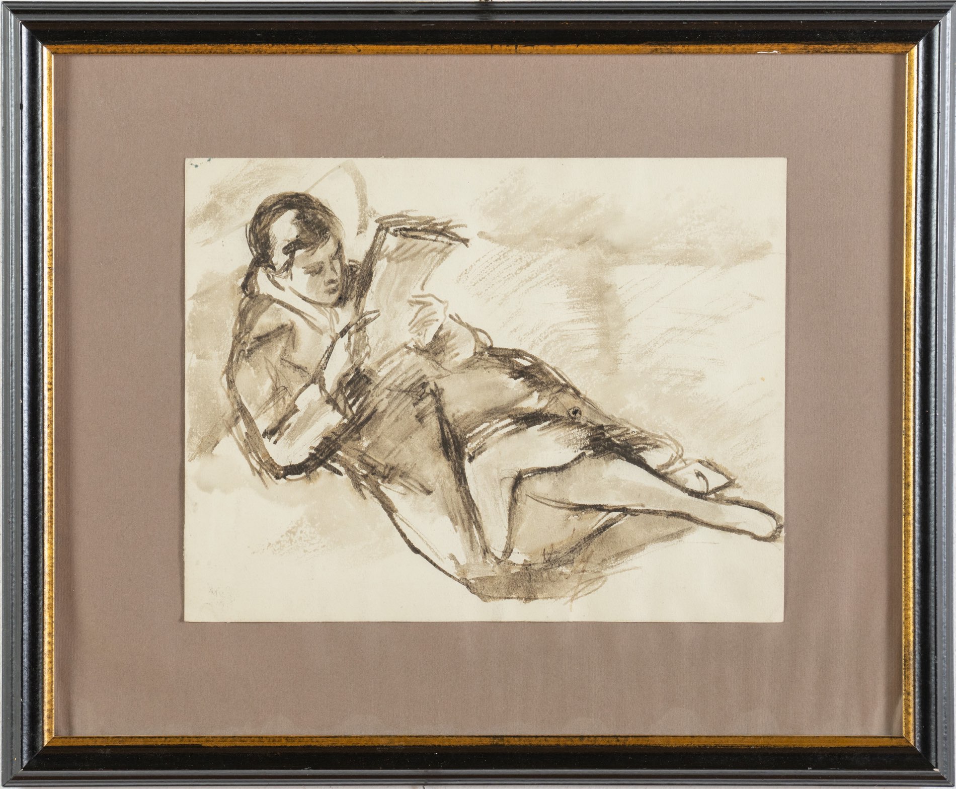 Gino Marzocchi (Molinella 1895 - Bologna 1891), “Donna che legge distesa”. Tecnica mista, presenta sigla “GM” in basso al centro, H cm 26.5x34.5