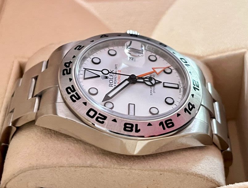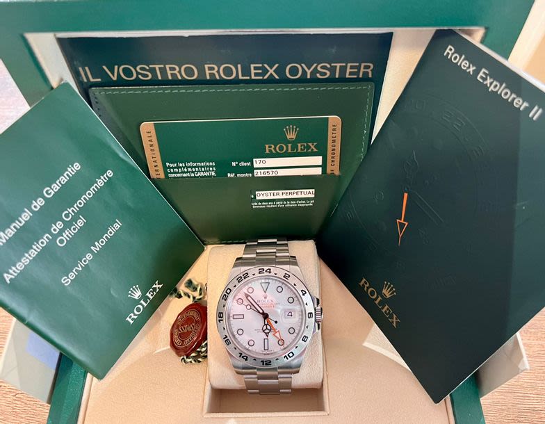 Marca Rolex Modello (Orologio) Explorer II Numero di referenza 216570 Carica Automatico Materiale della cassa Acciaio Materiale cinturino Acciaio Anno di produzione 2014/2019 Condizione Eccellente Corredo Con scatola di fornitura e documenti originali Calibro Carica Automatico Cassa Materiale della cassa Acciaio Diametro 42 mm Impermeabile 10 ATM Materiale lunetta Acciaio Vetro Vetro zaffiro Quadrante Bianco Numeri sul quadrante Senza numeri Cinturino Materiale cinturino Acciaio Colore cinturino Acciaio Chiusura Déployante Materiale chiusura Acciaio