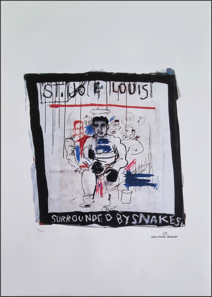 BASQUIAT JEAN-MICHEL New York 1960 - 1988 "Senza titolo" Riproduzione litografica offset cm 50x70. Firma in stampa sul fronte in basso a destra, tiratura 113/250 e timbro a secco a sinistra.