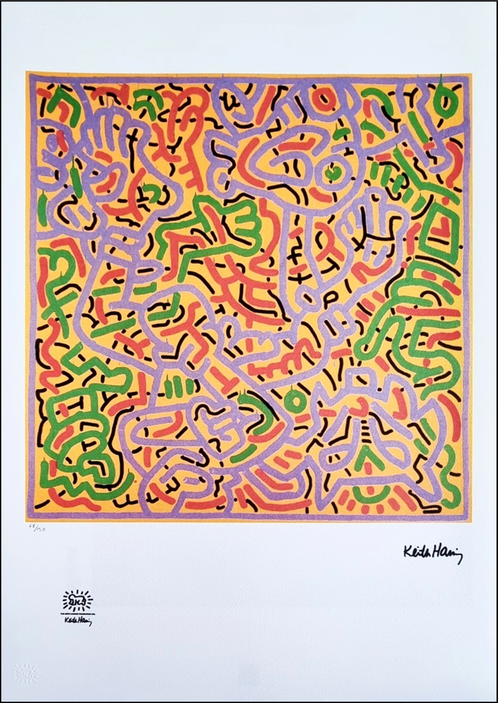 HARING KEITH Pennsylvania 1958 - New York 1990 "Senza titolo" Riproduzione litografica offset cm 50x70. Firma in stampa sul fronte in basso a destra, tiratura 68/150, timbro a secco e timbro in stampa a sinistra.