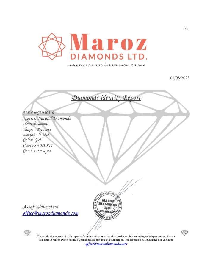 4 DIAMANTI 0,87 CT COLORE G-J - PUREZZA VS2-SI1 - TAGLIO PRINCESS - CERTIFICATO ID - C30803-6