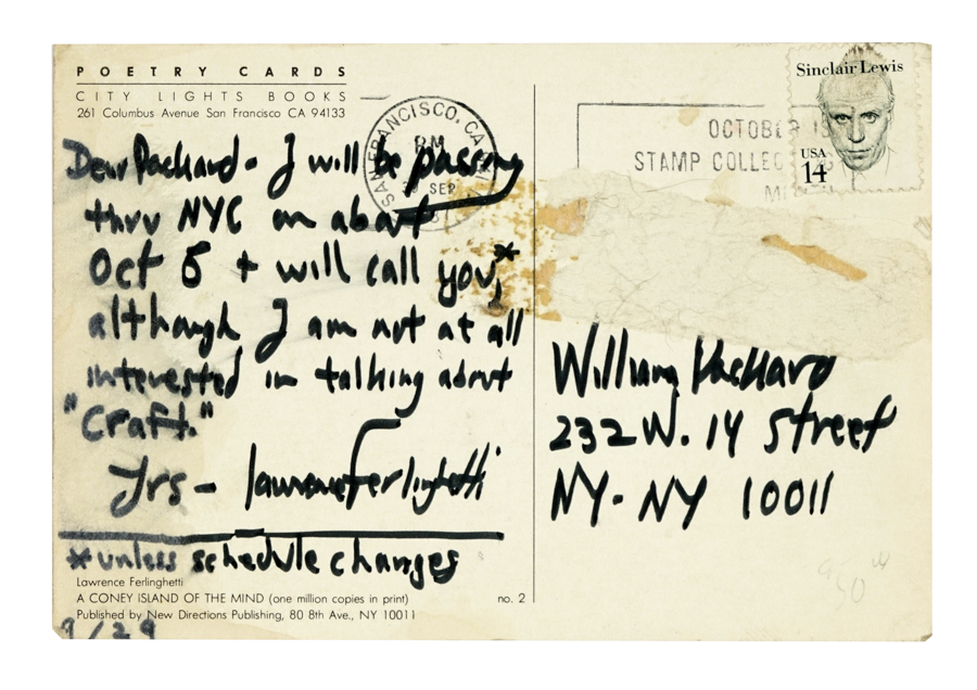 Ferlinghetti Lawrence, Cartolina con testo e firma autografa inviata a William Pachard. Non datata.