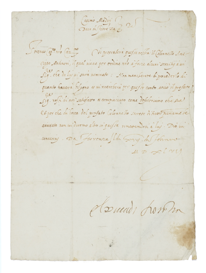 Medici Cosimo I (de), Lettera con firma autografa - El duca di Florentia - inviata a Roso da Vicchio, capitano della banda del Mugello. Firenze, 17 febbraio 1547. Manoscritto a inchiostro bruno. 1 bifolio, scritta 1 pagina. Su carta con filigrana. Al verso il nome del destinatario. Tracce di sigillo. Dimensioni: 293x217 mm. SI AGGIUNGONO: Medici Giovanni (de). 2 lettere, una autografa, l'altra con firma autografa. Datate 1617-1618. (3)I DOCUMENTO: Nella lettera, inviata a Roso Da Vicchio fedele ufficiale delle truppe dei Medici – prima di Giovanni dalle Bande Nere e poi di Cosimo I, si legge: «[...] Vi presenterà questa nostra il Colonnello Amerigo Antinori il quale viene per ordine nostro à fare alcuni servitij a un Sig.re che da luj vi sarà nominato. Non mancherete di provederlo di quanto haverà bisogno e vi ricercherà per questo conto acciò il prefato Sig.re resti di noi satisfato et compiaciuto come desideriamoo che sia. Et che di bocca del prefato Colonnello sarete di tutto premamente avvisato non vi diremo altro in questa [....].» Cosimo fu Duca di Firenze dal 1537 fino alla morte, avvenuta nel 1574. II DOCUMENTO: Don Giovanni de' Medici, figlio naturale di Cosimo I, venne legittimato per volontà paterna. La lettera autografa di Giovanni de' Medici è afferente alla Guerra di Gradisca e l'altra al pagamento di un debito.
