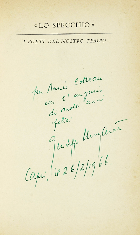 Ungaretti Giuseppe, Dedica autografa su libro Vita d’un uomo. IV. 40 sonetti di Shakespeare. Milano, Mondadori 1956. Manoscritto a inchiostro verde. Dedica all'occhiello. Brossura originale con velina protettiva. (1)Dedica autografa scritta da Capri: «per Annie Cottrau / con l'augurio / di molti anni / felici / Giuseppe Ungaretti / Capri, il 26/2/1966».