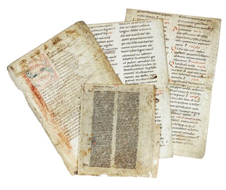 Raccolta di 5 pergamene. Testi profani e sacri. Secoli fine XII circa – XIV secolo. Manoscritti pergamenacei a inchiostro marrone scuro. Testi in latino. Scrittura carolina e gotica (anche gotica tedesca). Talune iniziali rubricate. Alcuni fogli sono stati anticamente recuperati da legature. Sono presenti difetti: alcuni brevi strappi, talvolta alcune mancanze, restauri e scoloritura dell'inchiostro (anche alla grande iniziale S del foglio che contiene una grammatica). Dimensioni varie. SI AGGIUNGE: 7 doppie carte, realizzate in scrittura minuscola con molte abbreviazioni, che contengono un trattato di filosofia (De Substantia, De Quantitate, De Qualitate ecc). XIII secolo circa. (5)I DOCUMENTO: La raccolta comprende frammenti di codici: 1 foglio con grande iniziale S ornata con frammento della grammatica latina, il Doctrinale, di Alexandre de Villedie (1175-1240) il cui incipit, presente sul foglio è Scribere clericulis paro Doctrinale novellis – 1 foglio che contiene probabilmente un'opera teologica nella quale è nominato Ugo di Sa. Vittore (1096-1141) - 1 foglio con frammento del Vangelo secondo Giovanni, nel quale vengono nominati Pietro, Tommaso, Cana, le Galilea, la passione di Cristo e l'imperatore Traiano – 2 fogli a inchiostro nero e rosso 'es. missa in consecratio virginum' contenenti frammento di messale – 2 fogli pergamenacei che contengono il Libro dei Re (Antico Testamento).