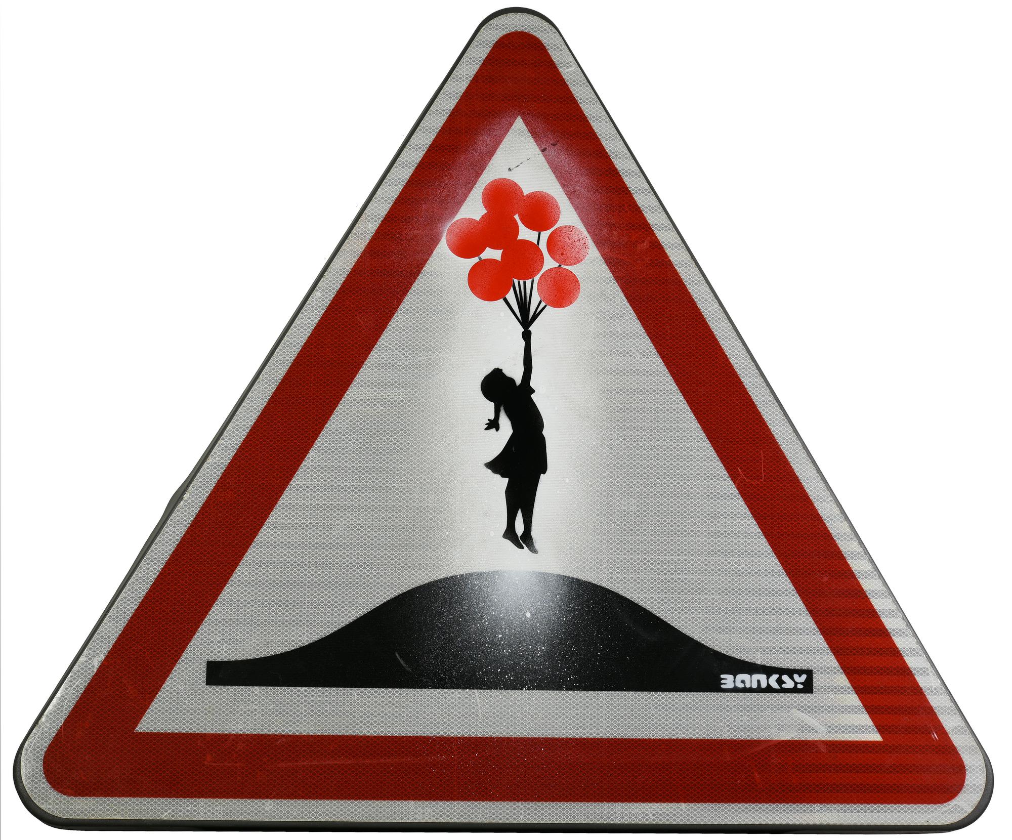 Da Banksy FLYING BALLON GIRL stencil print su cartello stradale, cm 83x90x2...