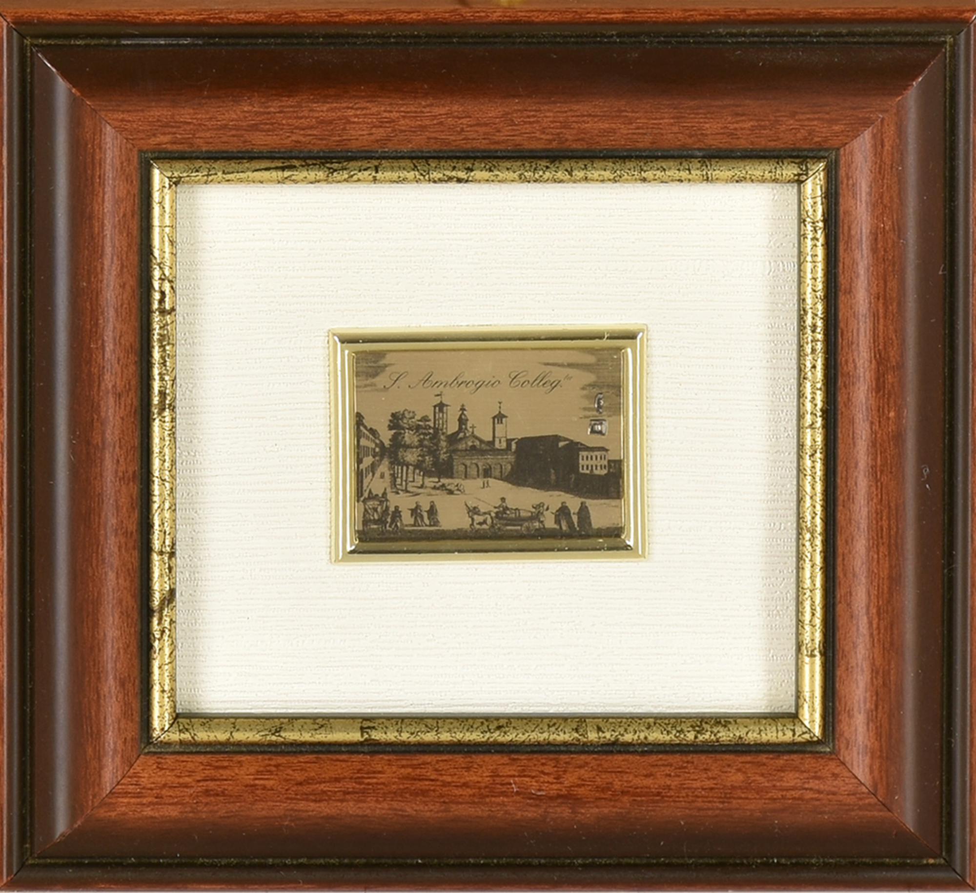 comoposto da tre incisioni su lastra di metallo e oro raffiguranti vedute di Assisi e Milano