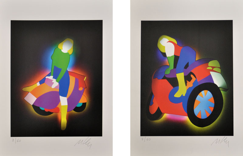 MARCO LODOLA Lotto unico di due litografie a colori firmate e numerate - Ragazza in vespa – es. 8/60 cm. 48x34 - Ragazza in moto – es. 7/60 cm. 48x34 Scorniciate