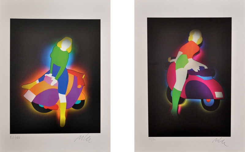 MARCO LODOLA Lotto unico di due litografie a colori firmate e numerate - Ragazza in vespa – es. 12/60 cm. 48x34 - Ragazza in vespa – es. 27/70 cm. 48x34 Scorniciate