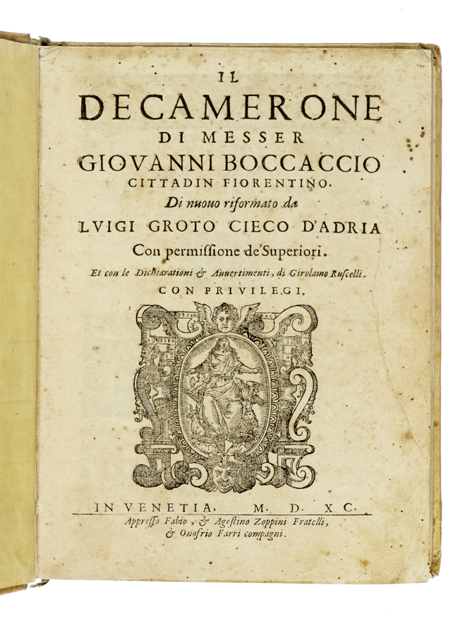 Boccaccio Giovanni, Il Decamerone [...] Di nuovo riformato da Luigi Groto cieco d'Adria. In Venetia: appresso Fabio, et Agostino Zoppini fratelli, & Onofrio Farri compagni, 1590.