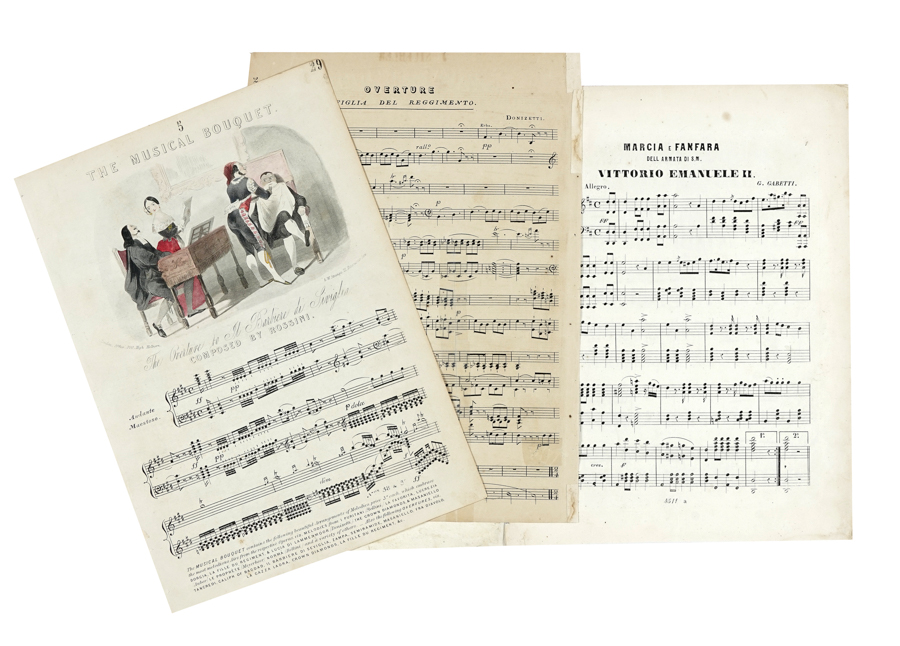 Raccolta di 18 spartiti illustrati per pianoforte solo e pianoforte e voce. Datati 1820-1880. Testi musicali a stampa. Tecniche di stampa: xilografia e due matrici, litografia (a due pietre, acquarellata). 4 spartiti non sono completi del testo musicale. Alcuni segni d'uso. Dimensioni: 320x260 mm ca. (18)Spartiti rari e ricercati, esempi di una nuova tipologia di prodotto editoriale: lo spartito illustrato. Edizioni pubblicate a Parigi, a Londra e in Italia. Contengono vignette litografiche al titolo, alcune di grande fascino. Gli spartiti sono elencati in ordine cronologico, indicando prima il nome dell'illustratore. La raccolta comprende: -Jean Pierre Sudre. Le départ du guerrier. Paris, Sudre [1820]. Si tratta di uno dei primi spartiti francesi con copertina illustrata in litografia. -Bellange Hippolyte. Pietro. Ballade. Musica di Casimir Delavigne. Paris, Godefroy Engelmann 1829. -Anonimo. The overture to Il Barbiere di Siviglia. Musica di Gioachino Rossini. London, Musical -Bouquet [anni '30 del XIX secolo] (litografia acquarellata). -Sanglumé. Le retour de Pierre ou le conge du soldat. Musica di Charles Plantade. Paris, chez Frey [prima del 1838]. -Sulpice Guillaume Chevalier (alias Gavarni). Musica di L. Niedermeyer. Paris, Schlesinger 1838. -Etienne Chàvanne. Ouverture ti La fille du Reggiment. Musica di Gaetano Donizetti. London, Musical Bouquet [1840] (litografia acquarellata). -Eugène Hippolyte Forest. Musica di E. Delisle e parole di H. Maignand. S.l. [1840]. -Frédéric Sorrieu. Barcarolle. Musica di Franz Schubert e parole di Belanger. Paris, Richault Editeur [1840]. -Jules David. Frantz le chasseur. Musica di Boulanger e Kunzè e parole di Th. Muzet. Paris, J. Delahante [1840]. -Edouard Wattier. Au revoir jamais adieu. Musica di A. de Beauplan e parole di D. Valmore. Paris, chez Frère [1840]. -Engelmann. Les refrains du pays. Musica di Jacques Strunz e parole di A. Bétourné. Paris, Schlesinger [1840]. -Thomas Howell Jones. Alonso the brave. Musica di J. Harroway e parole di san Cowell. London, The Music-Publishing Company [1850]. -Honoré Daumier. Pauvres hommes! Musica e parole di Edmond Lhuillier. Paris, Gérard [1850]. -Giulio Rossi. Marcia d'ordinanza dell'Armata di S. M. Vittorio Emanuele II. Musica di Gabetti. Torino, Giudici e Strada 1859. -Paul Gustave Dorè. Le lac. Musica di L. Niedermeyer e parole di A. Lamartine. Paris, Pacini [1860]. -Armand Louis Henri Télory (alias Enry Emy). Clarisse Harlowe. Musica di Gatien Marchailhou. Paris, Boureau Central de Musique [1860]. -Gustave Donjean. Rêves et Souvenires. Musica di O. Batifort. Paris, La fleur Auné Editeur [1870]. -E. Buval. Les moineaux des Francs-Bourgeois. Musica di Edmond Missa. Paris, J. Hiélard Editeur [1880]. Lotto da vedere.