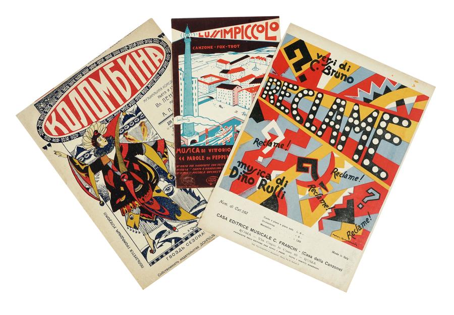 Raccolta di 9 spartiti musicali. Illustrazioni di copertina realizzate da Giovanni Acquaviva, Arturo Bonfanti, Nisa, Kostantin Mironov, Manno Manni ecc. Datati 1925-1936. Testi musicali a stampa. Tecniche di stampa: zincografia a due, tre e quattro lastre, litografia a due pietre, cromolitografia. Spartiti per pianoforte e voce, mandolino e canto solo. Spartiti pubblicati in Italia e Russia. Alcuni segni d'uso. Dimensioni: 330x240 mm ca. (9)Gli spartiti sono elencati in ordine cronologico, indicando prima il nome dell'illustratore. La raccolta comprende: -Nikolaj Kashcheev. Kolombina. Musica di A. Riabov e parole di V. Lensky. Rostov sul Don, Donpoligrafbuma 1925. -Guglielmo Lippi Francesconi. Bambile Lenci. Musica di Marcello Cortopassi e parole di M. Romagnoli. La Spezia, Cortopassi 1927 (con dedica e firma del compositore). -Manno Manni [attribuito]. Reclame. Musica di Dino Rulli e parole di C. Bruni. Roma, Franchi 1928. -Kostantin Mironov. Turandot. Musica di G. Puccini. Mosca, Muzykalbny Sektor 1928. -Arturo Bonfanti. Lussimpiccolo. Musica di V. Mascheroni e parole di Peppino Mendes. Milano, Carisch 1929. -Carlo Cossio. E' vietato. Musica di Nicola Moleti e parole di Peppino Mendes. Milano, Carisch 1930. -Umberto Onorato. ... Fa la cortesia. Musica di V. Mascheroni e parole di Mario Buzà. Milano, Carisch 1932. -Nicola Salerno (alias Nisa). Decalcomanie. Musica di Mario Persico 1934. -Giovanni Acquaviva. Siciliana. Musica di Virgilio Mortari. Milano, Carisch 1936. Lotto da vedere.