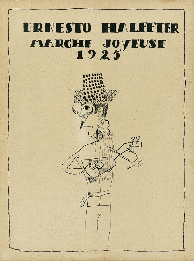 Halffter Ernesto, Marche Joyeuse / 1925. Copertina illustrata da Salvador Dalì. Numero editoriale 15635. Madrid, Uniòn Espagnola 1925. Spartito per pianoforte (335x255 mm). Pagine 7. Zincografia. Brossura e frontespizio staccati, ma carte in ottimo stato. (1)Illustrazione del giovanissimo e ancora sconosciuto Dalì che si ritrae su questo spartito nelle vesti di un menestrello. La musica è dell'altrettanto giovane Halffter (1905-1989), compositore spagnolo. L'amicizia tra Halffter e Dalì durò tutta la vita, tanto che nel 1974 l'artista commissionò al compositore un brano per celebrare l'inaugurazione del Museo Dalí.
