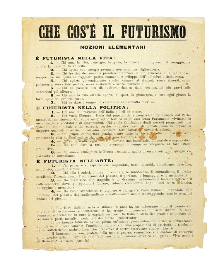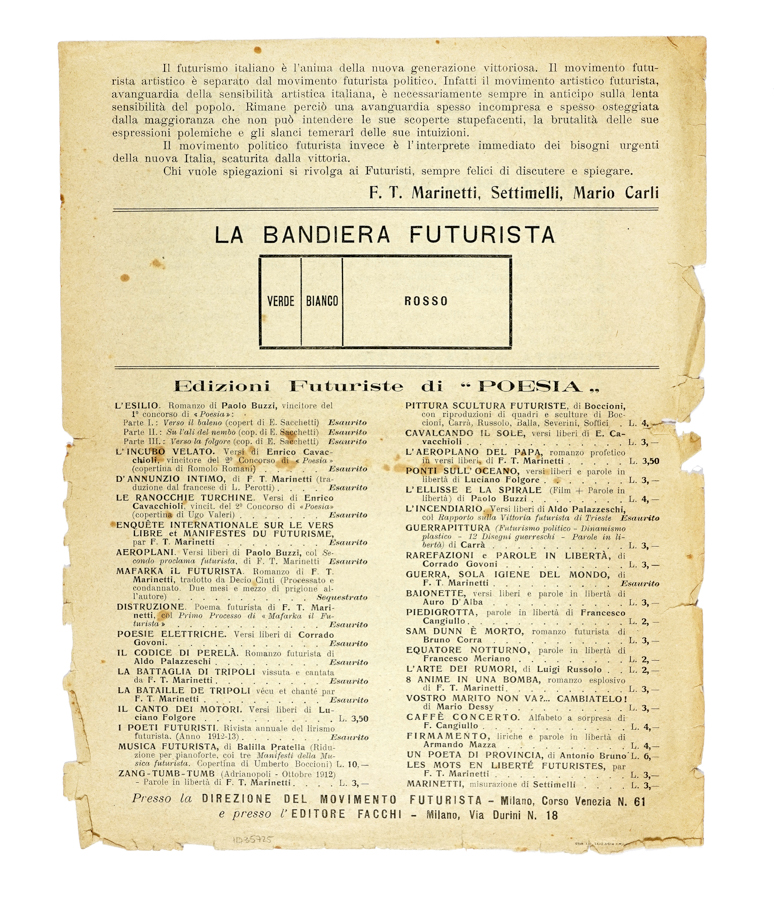 Marinetti Filippo Tommaso, Che cos'è il futurismo. Nozioni elementari. Milano: Direzione del Movimento Futurista, s.d. [dicembre 1920]. In-4° (mm 290x230). Carta [1]. Segno centrale di precedente piegatura, macchie e gravi strappetti marginali con mancanze e rare perdite di testo. (1)Manifesto pubblicato per la prima volta il 16 febbraio 1919 su Roma Futurista. Anno II, n. 7 e, nello stesso mese, su Dinamo. Rivista Futurista, Anno I, n. 1. Seguono tre versioni in volantino: la prima edizione (marzo 1919), in due differenti tirature: una con al verso la pubblicità per l'Esposizione Nazionale Futurista di Milano e l'indicazione di stampa 'Stab. Tip. Taveggia - Milano Via Ospedale 3'; l'altra per Roma Futurista e Dinamo (con indicazione di stampa 'Stab. Tip. Taveggia - Milano'); nel dicembre 1920, esce un'altra edizione (come la nostra) con significative varianti nel testo e il disegno de La Bandiera Futurista di Francesco Cangiullo al verso, che non compare nelle versioni precedenti. Futurismo. Gussago (BS): L'Arengario Studio Bibliografico, 2001,12; cfr. Futurismo (catalogo di vendita n. 100). Firenze: Libreria Salimbeni, 1991, 358.