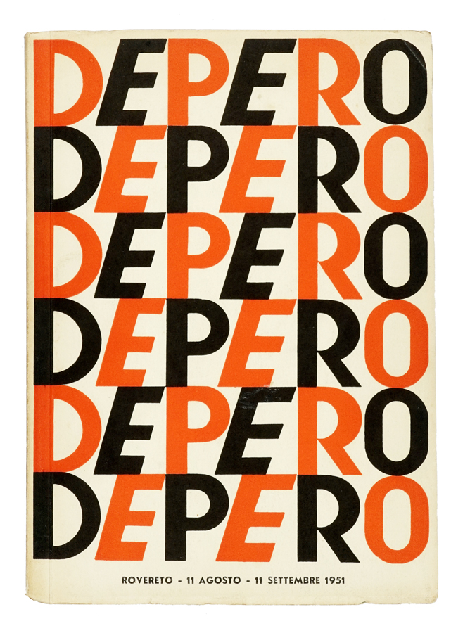 Depero Fortunato, 88ma Mostra Depero. Pittura e arte applicata 1915-1951, prima presentazione di pittura nucleare. Rovereto: Manfrini, [1951]. In-8° (mm 226x160). Carte [38] con 34 illustrazioni in 17 carte di tavole, di cui una a colori in antiporta protetta da velina con didascalia, il resto in bianco e nero. Brossura editoriale stampata al piatto anteriore in rosso e nero, con lievi bruniture da esposizione. (1)Edizione originale del catalogo della 88ma mostra personale di Depero tenutasi a Rovereto da agosto a settembre 1951. Oltre a tre fotografie della quinta mostra dell'Artista (1916), sono riprodotte 31 sue opere. Cfr. Cammarota 169.18.
