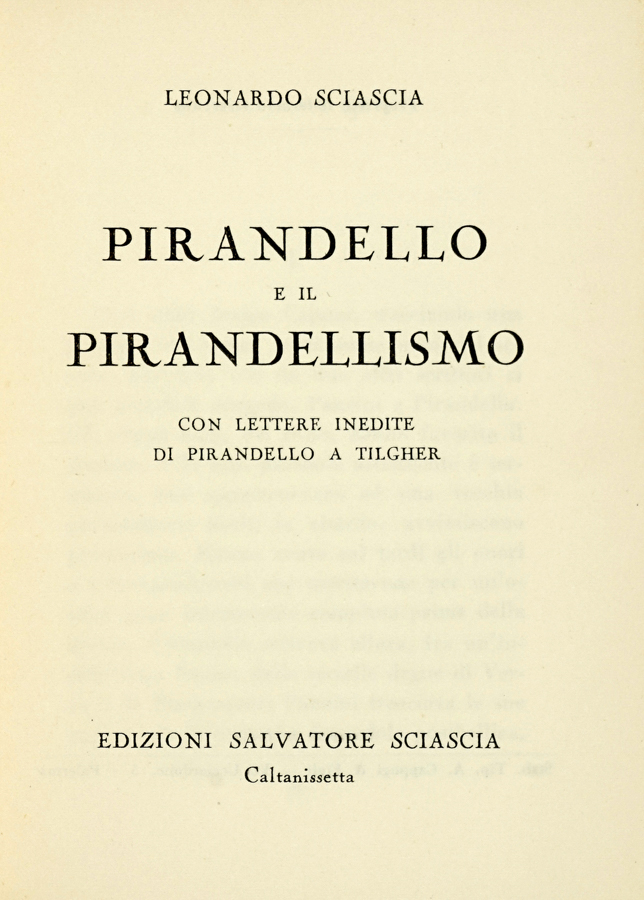 Sciascia Leonardo, Pirandello e il Pirandellismo con lettere inedite di Pirandello a Tilgher. Caltanissetta: edizioni Salvatore Sciascia, 1953.