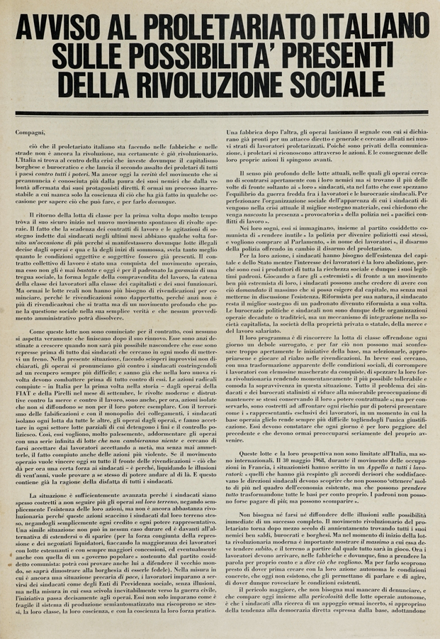 Sanguinetti Gianfranco e altri, Internazionale situazionista. Rivista della sezione italiana dell'I.S. N. 1 - Luglio 1969. Milano: Nava, 1969. In-8° (mm 240x157). Pagine 144. Aloni da ingiallimento marginali, lievi e uniformi, ma copia in ottimo stato. Brossura originale verde con titoli al piatto anteriore. Tracce d'uso. SI AGGIUNGE: Avviso al proletariato italiano sulle possibilità presenti della rivoluzione sociale. Internazionale Situazionista, 19 novembre 1969. Manifesto stampato recto-verso (mm 495x395). Leggermente brunito, con lievi fioriture sparse, uno strappetto e una piccola mancanza, senza perdite di inciso, al margine superiore. SI AGGIUNGE: Internazionale Situazionista, Gli operai d'Italia e la Rivolta di Reggio Calabria. Milano: Stampa Grafiche A. Nava, s.d. [i.e. ottobre 1970]. In-8° (mm 208x150). Carte [6]. Lieve gora marginale e pieghe da umidità. Brossura originale con titoli al piatto anteriore e a quello posteriore la riproduzione in bianco e nero di un articolo di giornale del 1871 a firma di Giuseppe Piccio, contro la Prima Internazionale; alla terza di copertina, la ristampa del volantino distribuito il 19 dicembre 1969 dopo la strage di Piazza Fontana del 12 dicembre dello stesso anno dal titolo Il Reichstag brucia?. (3)I OPERA: Raro primo e unico numero, pubblicato dalla sezione italiana dell'Internazionale Situazionista e curata da Claudio Pavan, Paolo Salvadori e Gianfranco Sanguinetti, che contiene, tra gli altri, la traduzione italiana del quarto capitolo de La Société du Spectacle di Guy Debord, riveduta dall'autore, in polemica con la versione integrale dell'opera pubblicata dall'editore De Donato «[...] a causa della deformazione del testo e degli equivoci talvolta grotteschi dei 'traduttori'.». Questo primo numero superò ampiamente le aspettative, tanto che anche lo stesso Debord ne fu colpito: «Credo che in Italia non sia stato scritto niente di così forte dai tempi di Machiavelli.». (Amoròs, Breve storia della sezione italiana dell'Internazionale Situazionista, 2015, p.16). II OPERA: Supplemento al n.1 della rivista Internazionale Situazionista, estremamente raro, con il programma del movimento. III OPERA: Prima edizione di questo secondo supplemento al n. 1 della Rivista, relativo alla Rivolta di Reggio Calabria (luglio 1970-febbraio 1971), uno dei moti di protesta più significativi della storia dell'Italia unita, per durata e intensità, che ebbero inizio nel luglio del 1970 e si conclusero nel febbraio del 1971 con l'inquietante immagine dei carri armati sul lungomare della città.