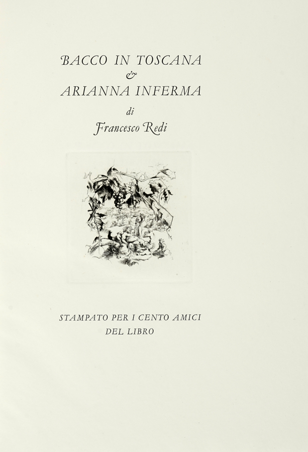 Redi Francesco, Bacco in Toscana & Arianna Inferma. [Firenze]: Cento amici del libro, [1940]. (Al colophon:) Verona: Officina Bodoni di Giovanni Mardesteig, 1940.