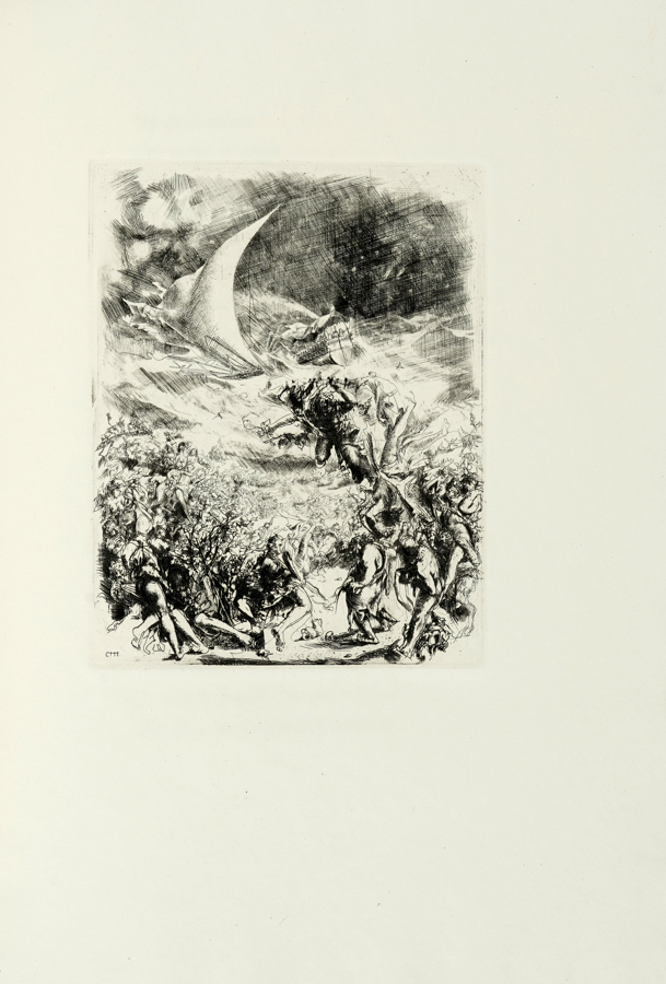 Redi Francesco, Bacco in Toscana & Arianna Inferma. [Firenze]: Cento amici del libro, [1940]. (Al colophon:) Verona: Officina Bodoni di Giovanni Mardesteig, 1940. In-folio (mm 350x243). Pagine 4 bianche, 78, [6]. Vignetta al frontespizio, testatine, finalini e 4 grandi tavole a piena pagina nel testo, il tutto inciso all'acquaforte da Pietro Annigoni e protetto da velina. Ottima copia, perfettamente conservata nelle sue barbe. Legatura in cartonato, con titoli su tassello cartaceo al piatto e al dorso, e taglio superiore dorato; entro custodia in cartonato verde. Segni da esposizione al dorso e lievissime e rare fioriture al piatto della custodia. Uno dei 100 ad personam, su una tiratura complessiva di 120 esemplari su carta delle cartiere Magnani di Pescia. (1) Il secondo volume delle Edizioni Cento Amici del Libro, con 4 acqueforti di Pietro Annigoni. Mardersteig 48; Parole figurate 52-53.