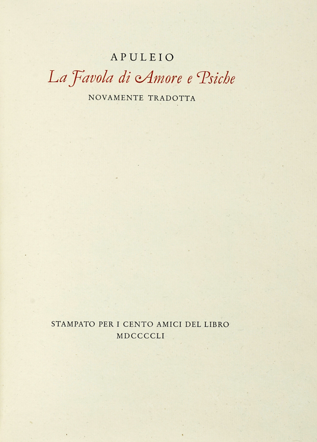 Apuleius, La Favola di Amore e psiche novamente tradotta. [Firenze]: Cento Amici del Libro, 1951. (Al colophon:) Verona: Officina Bodoni, 1951.