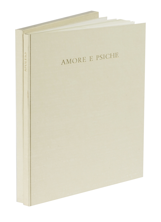 Apuleius, La Favola di Amore e psiche novamente tradotta. [Firenze]: Cento Amici del Libro, 1951. (Al colophon:) Verona: Officina Bodoni, 1951. In-4° (mm 325x245). Pagine [2] bianche, 78, [4]. Con 13 litografie originali acquerellate a mano di Aldo Salvadori. Cartonato editoriale in carta Roma avorio, titoli stampati in oro sul dorso e sul piatto anteriore; custodia editoriale. Uno dei 100 esemplari ad personam, su una tiratura complessiva di 120 copie su carta a tino Montval. (1)Mardersteig 97; Parole figurate 66.