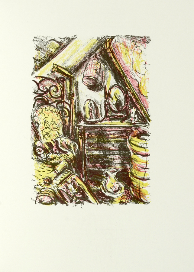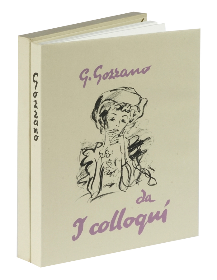 Gozzano Guido, Liriche scelte da «I colloqui». [Firenze]: Cento Amici del Libro, 1954. (Al colophon:) Verona: Officina Bodoni, 1954. In-4° (mm 305x230). Pagine [2] bianche, 118, [8] (l'ultima carta bianca). Con 17 litografie a colori nel testo e 1 in bianco e nero nella brossura di Renato Cenni. Brossura editoriale avorio illustrata, protetta da velina, entro custodia in cartone. Edizione stampata in 120 esemplari ad personam su carta a tino Fabriano con firma di Sanminiatelli. (1)Nono volume pubblicato, la «[...] prima edizione in cui apparve la nuova sigla CAL incisa da Bruno Bramanti. Da questo momento essa sarà stampata in tutti i libri dei Cento Amici del Libro.» (Mardersteig 108); Parole figurate 72.