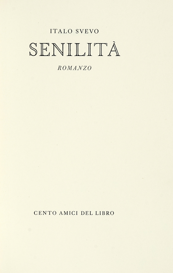Svevo Italo, Senilità. Romanzo. [Firenze]: Cento amici del libro, [1964]. (Al colophon:) Verona: Officina Bodoni di Giovanni Mardesteig, 1964.