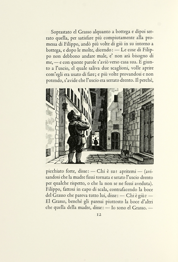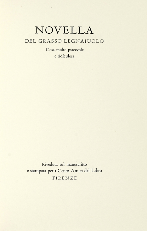 Novella del grasso legnaiuolo, cosa molto piacevole e ridiculosa a cura di Gianfranco Folena. [Firenze]: Cento amici del libro, [1965]. (Al colophon:) Verona: Officina Bodoni di Giovanni Mardesteig, 1965. In-8° (mm 260x175). Pagine [4] bianche, 62, [3], [3] bianche. Con 8 xilografie di Italo Zetti nel testo. Copia perfettamente conservata nelle sue barbe. Legatura originale in piena pergamena con titoli in oro al dorso e taglio superiore dorato; custodia in cartonato verde. Uno dei 100 esemplari in numeri romani, su una tiratura complessiva di 117 copie. Firma di Bino Sanminiatelli in blu al colophon. (1)Il sedicesimo volume pubblicato dai Cento amici del libro. Parole figurate 90-91; Mardersteig 138.
