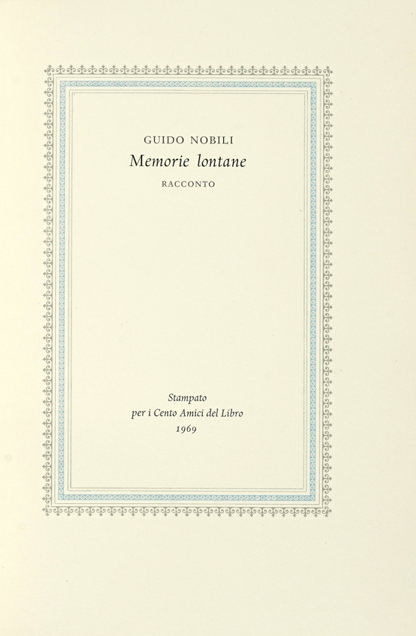 Nobili Guido, Memorie lontane. Racconto. [Firenze]: Cento amici del libro, [1969]. (Al colophon:) Verona: Officina Bodoni di Giovanni Mardesteig, 1969.