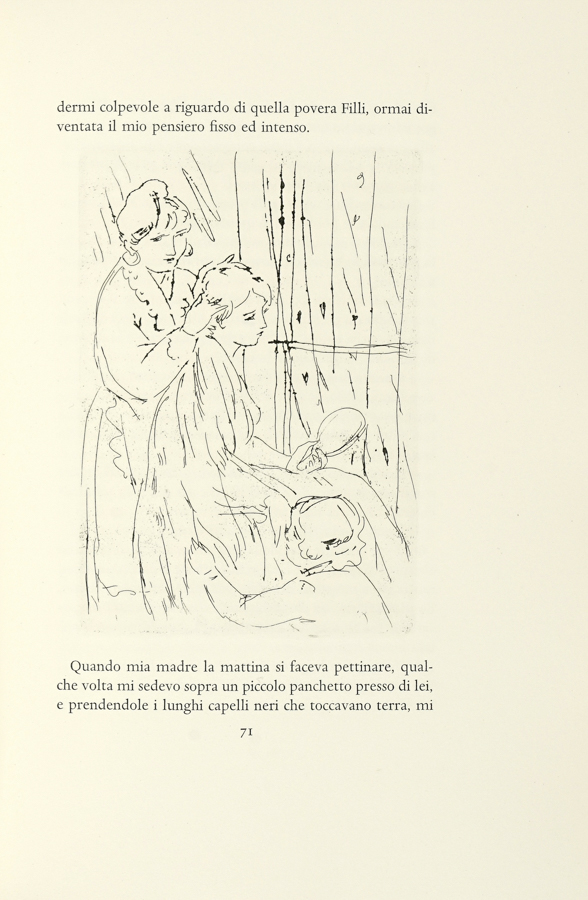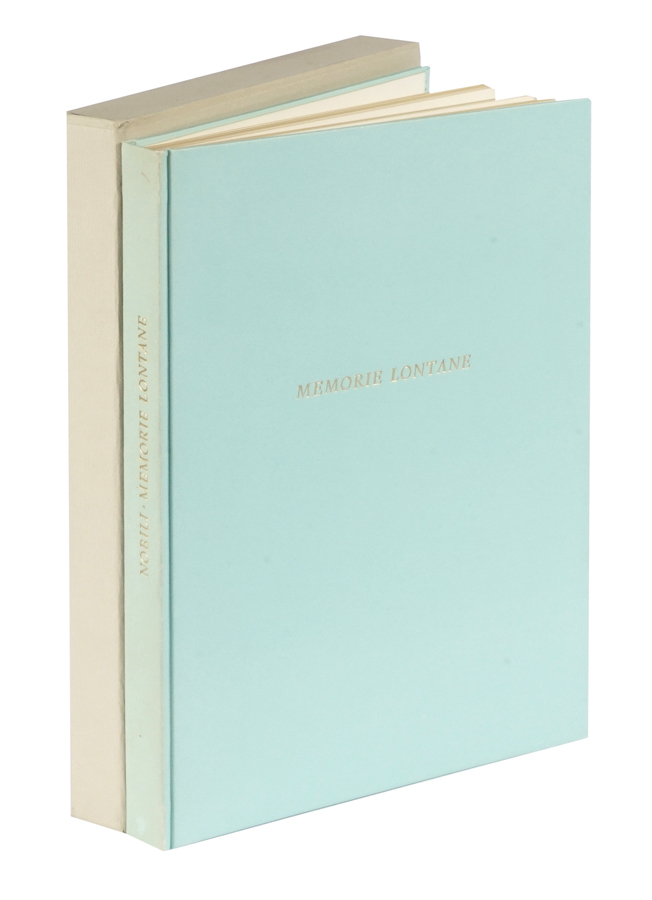 Nobili Guido, Memorie lontane. Racconto. [Firenze]: Cento amici del libro, [1969]. (Al colophon:) Verona: Officina Bodoni di Giovanni Mardesteig, 1969. In-4° piccolo (mm 280x190). Pagine 4 bianche, 100, [4], 4 bianche. Con 10 acqueforti di Alberto Manfredi nel testo. Legatura originale in cartonato azzurro con titoli in oro al piatto anteriore e al dorso e taglio superiore giallo; entro custodia in cartone. Leggere tracce da esposizione al dorso. Uno dei 100 esemplari in numeri romani, su una tiratura complessiva di 117 copie, con la firma di Sanminiatelli al colophon. (1)Parole figurate 94-95; Mardersteig 160.