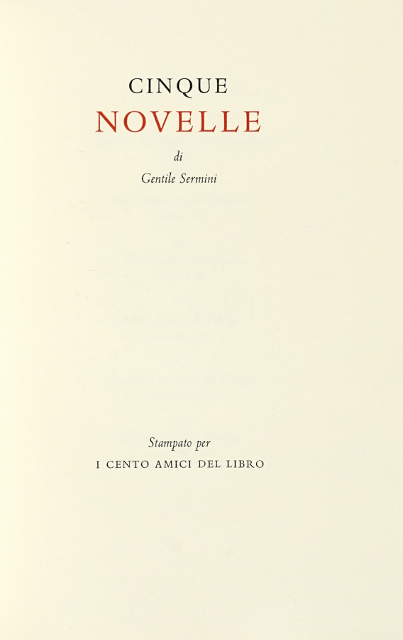 Sermini Gentile, Cinque novelle […] nota di Domenico De Robertis, acqueforti di Carlo Mattioli. [Firenze]: Cento amici del libro, [1970]. (Al colophon:) Verona: Officina Bodoni di Giovanni Mardesteig, 1970).