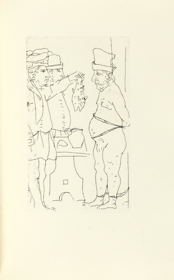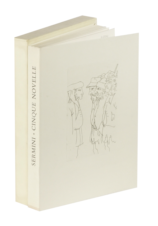 Sermini Gentile, Cinque novelle […] nota di Domenico De Robertis, acqueforti di Carlo Mattioli. [Firenze]: Cento amici del libro, [1970]. (Al colophon:) Verona: Officina Bodoni di Giovanni Mardesteig, 1970). In-8° (mm 230x155). Pagine [8], 176, [6]. Con 11 acqueforti di Carlo Mattioli nel testo. Ottima copia. Legatura in pieno cartonato editoriale, con due incisioni dell'Artista ai piatti; sovraccoperta in plastica e cofanetto in cartone. Uno dei 100 esemplari in numeri romani, su una tiratura complessiva di 118 copie. (1)Parole figurate 96-97; Mardersteig 168.