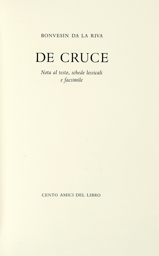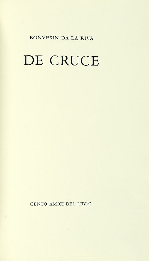 Bonvesin de la Riva, De Cruce. [Milano]: Cento Amici del Libro, [1982]. (Al colophon:) Verona: Officina Bodoni, 1982.