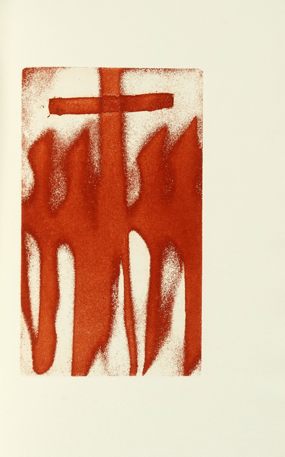 Bonvesin de la Riva, De Cruce. [Milano]: Cento Amici del Libro, [1982]. (Al colophon:) Verona: Officina Bodoni, 1982. 2 volumi in-4° (mm 308x205). Pagine [4] bianche, 25, [4] con 1 acquaforte originale a colori di Franca Ghitti protetta da velina; [2] bianche, 52, [14] (le ultime 2 carte bianche). Brossura editoriale illustrata con 1 acquaforte a colori di Franca Ghitti per il primo volume, editoriale con titoli impressi in nero al piatto anteriore per il secondo, entrambe in carta avorio, protette da velina. Entro custodia in cartoncino. Esemplare ad personam, su una tiratura di 130 copie su carta a Tino Magnani firmate a matita al colophon dall'Artista. (2)Parole figurate 104-105; il secondo volume è stato impresso dalla stamperia Valdonega a corredo dell'edizione dell'Officina Bodoni.