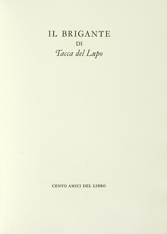 Bacchelli Riccardo, Il brigante di Tacca del Lupo. [Milano]: Cento Amici del Libro, [1988]. (Al colophon:) Verona: Officina Bodoni, 1988.