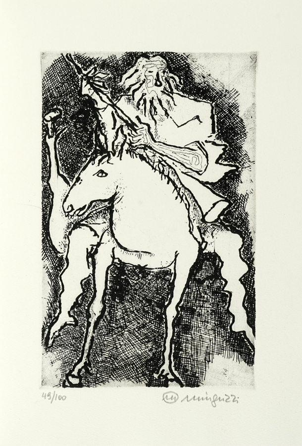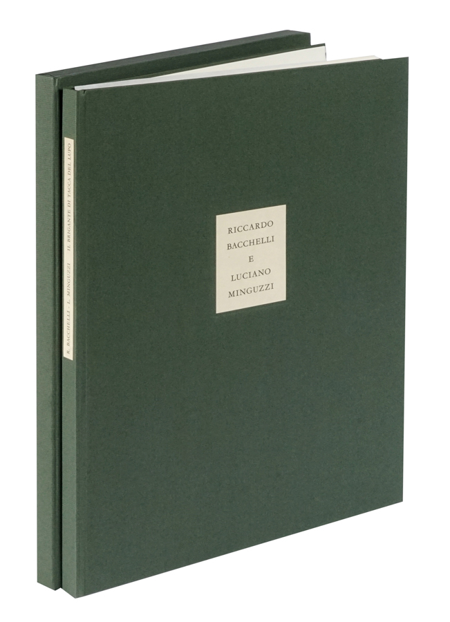 Bacchelli Riccardo, Il brigante di Tacca del Lupo. [Milano]: Cento Amici del Libro, [1988]. (Al colophon:) Verona: Officina Bodoni, 1988. In-folio (mm 330x245). Pagine 45, [3] con 5 acqueforti originali fuori testo di Luciano Minguzzi, numerate e firmate a matita dall'Artista; tutte protette da velina. Cartonato editoriale verde con titoli su tasselli cartacei al dorso e al piatto anteriore; velina protettiva e custodia in cartone verde. Uno dei 100 esemplari ad personam su una tiratura complessiva di 130 copie su carta a tino Magnani. (1)Parole figurate 112-113.