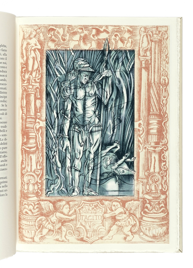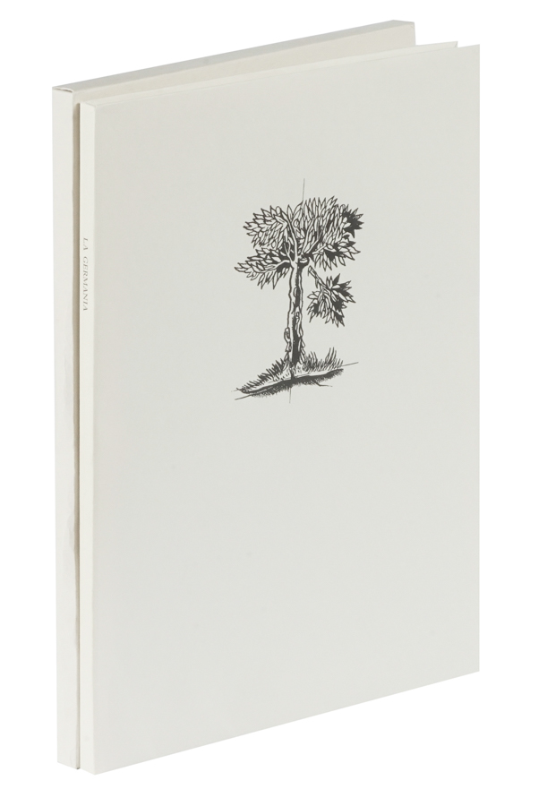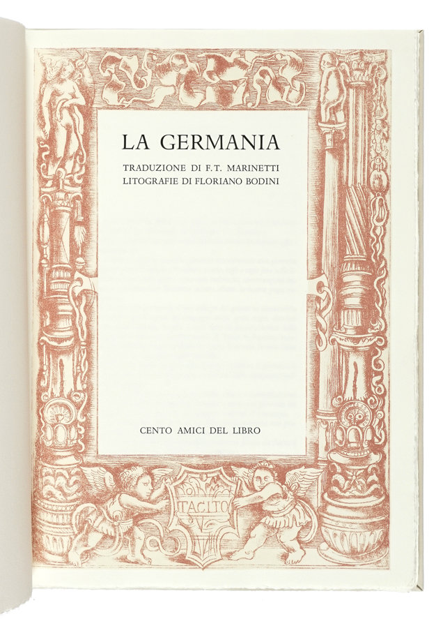 Tacitus Publius Cornelius, La Germania. Traduzione di Filippo Tommaso Marinetti. [Milano]: Cento Amici del Libro, [1993]. (Al colophon:) Santa Lucia ai Monti: Alessandro Zanella, 1993. In-folio (mm 350x245). Carte [30]. Litografie a colori di Floriano Bodini. Brossura editoriale illustrata, entro custodia in cartoncino grigio. Uno dei 100 esemplari ad personam su una tiratura complessiva di 130 copie su carta Alcantara firmate a matita al colophon dall'Artista. (1)Parole figurate 118.