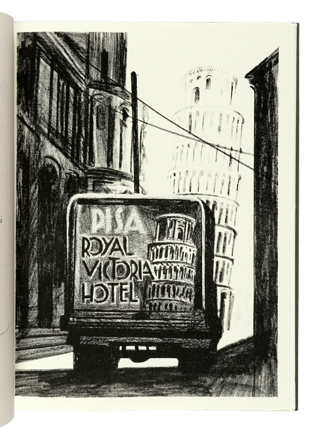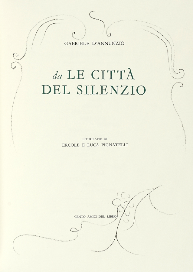 D'Annunzio Gabriele, Da: Le Città del Silenzio. Milano: Cento Amici del Libro, [1995]. (Al colophon:) Milano: Officina Tipografica Ruggero, 1995. In-folio (mm 350x260). Pagine 72, [4] con 12 belle litografie a piena pagina di Ercole e Luca Pignatelli nel testo. Brossura editoriale verde con titoli al piatto anteriore e al dorso, conservata in custodia in cartone. Ottima copia. Uno dei 100 esemplari ad personam su una tiratura complessiva di 130, firmati a matita dagli Artisti al colophon. (1)Parole figurate 124-127.