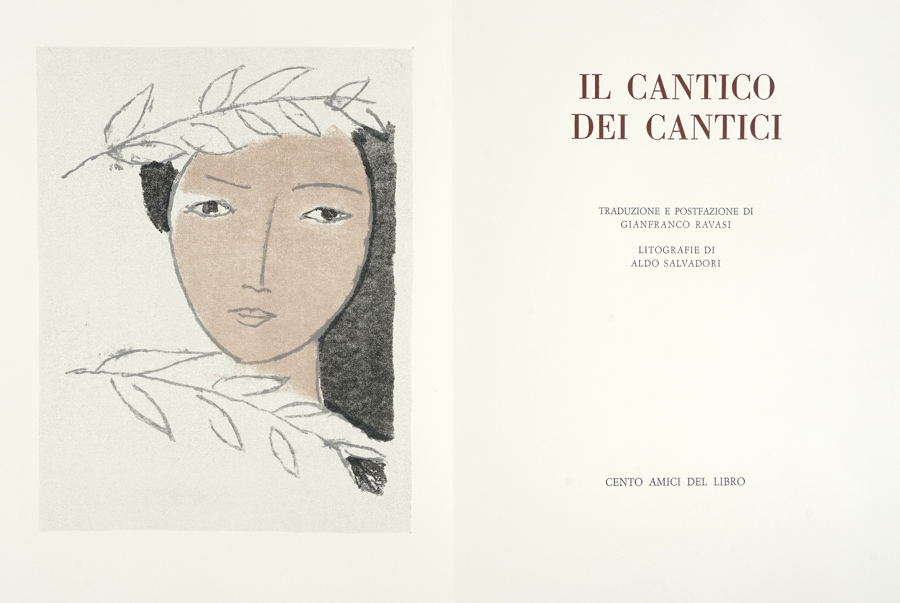 Ravasi Gianfranco, Il Cantico dei Cantici. [Milano]: Cento Amici del Libro, [1996] (Reggio Emilia: Fratelli Manfredi, 1996). In-folio (mm 356x266). Pagine [4], 45, [7] a fascicoli sciolti. Con 13 litografie originali a colori di Aldo Salvadori, anche a piena pagina. Brossura editoriale in carta verde illustrata con una litografia a colori di Salvadori applicata al piatto anteriore. Entro cofanetto in cartone, con lievi abrasioni al piatto anteriore. Uno dei 100 esemplari ad personam di una tiratura di 130 copie stampate su carta della Cartiera Sicars firmate a matita al colophon dall'Artista. (1)Parole figurate 128-131.