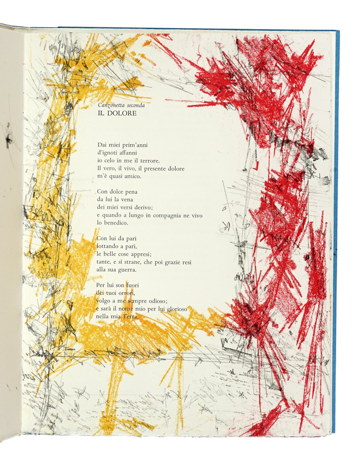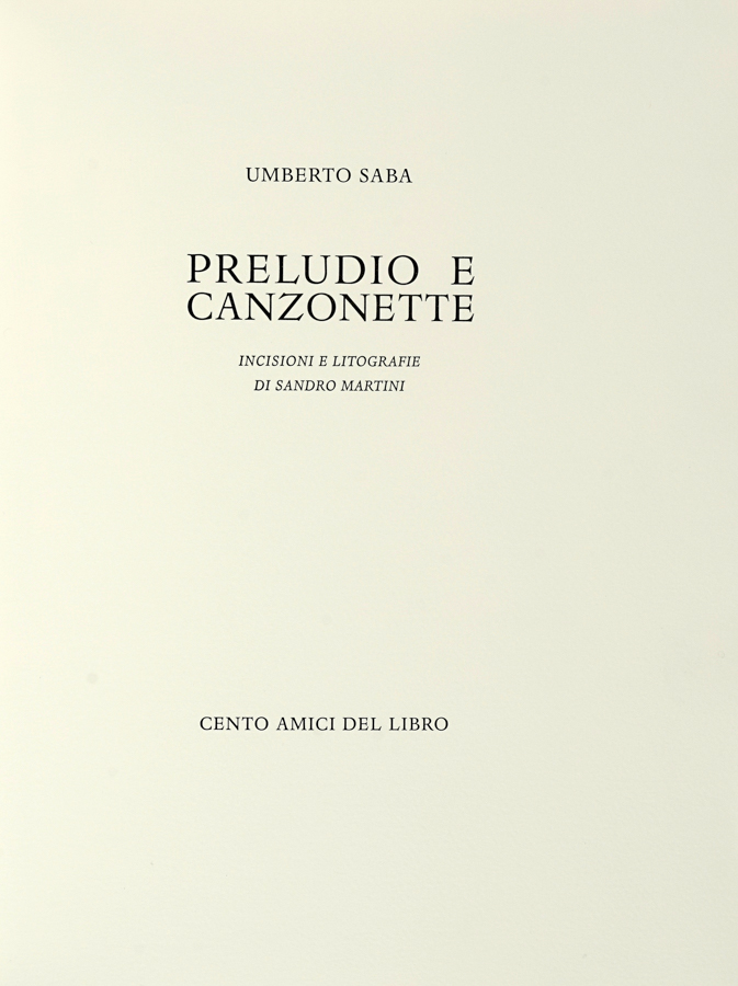 Saba Umberto, Preludio e canzonette. Milano: Cento Amici del Libro, 1999. In-folio (mm 330x250). Carte [25]. Splendide litografie e incisioni in nero e a colori di Sandro Martini nel testo. Brossura completamente illustrata ai piatti, con titoli in nero a quello anteriore; sovraccoperta originale bluette, con titoli in nero al dorso, e custodia in cartone coordinato, con uno strappo al dorso. Una delle 100 copie ad personam, su una tiratura complessiva di 130, firmate dall'Artista al colophon. (1)Parole figurate 132-133.