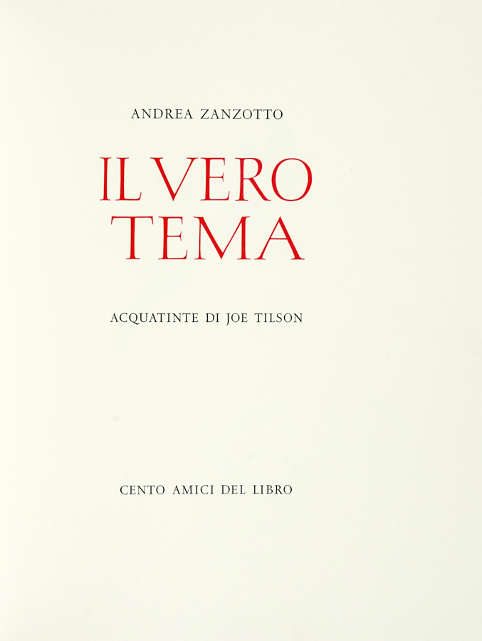 Zanotto Andrea, Il vero tema. Santa Lucia ai Monti: Alessndro Zanella, 2011. In-4° (mm 300x235). Con 4 belle acquetinte di Joe Tilson a piena pagina. Fresco esemplare in barbe. Brossura originale a colori, interamente impressa. Entro multiplo d'artista di Joe Tilson in legno, con figure in legno applicate al piatto posteriore e colorate a mano dall'Artista. Uno dei 100 esemplari ad personam, su una tiratura complessiva di 130 copie. (1)