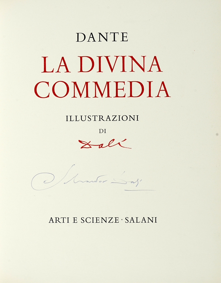 Alighieri Dante, La Divina Commedia. Illustrazioni di Dalì. Verona: Salani, Stamperia Valdonega, 1963-1964. 6 volumi in-folio (mm 332x253). Pagine [2], 158, [2], [2] bianche con 17 tavole a colori, sciolte fuori testo (numerate 1-17); [12], 173-326, [8] con 17 tavole a colori, sciolte fuori testo numerate 18-34; [2], 2 bianche, 162, [2], [2] bianche con 17 tavole a colori, sciolte fuori testo (numerate 1-17); [12], 173-328, [4], [2] bianche con 16 tavole a colori, sciolte fuori testo (numerate 18-33); [2], [2] bianche, 163, [1 ], [2] bianche con 17 tavole a colori sciolte fuori testo (numerate 1-17); [2], [2] bianche, [8], 173-320, [4], [2] bianche con 16 tavole a colori sciolte fuori testo (numerate 18-33). Lievi bruniture uniformi ad alcune tavole, altrimenti buona copia in barbe a fascicoli sciolti, stampata in nero; testo a due colori, rosso per i due tomi dell'Inferno, viola per il Purgatorio e blu per il Paradiso. Ottime condizioni. Ciascun volume entro brossura con titolo in rosso al piatto anteriore e velina protettiva, cartella e custodia in cartonato editoriali a motivi geometrici colorati, con lievi macchie e difetti. Tagliando di controllo conservato all'interno del secondo volume di Inferno e Paradiso. Uno dei 2900 esemplari impressi dalla Stamperia Valdonega su carta a mano dei Fratelli Magnani di Pescia, su una tiratura complessiva di 3044 copie. Iscrizione Salvador Dalì al frontespizio del primo volume dell'Inferno. (6)Celeberrima edizione della Commedia illustrata da Dalì. Mardersteig 133.