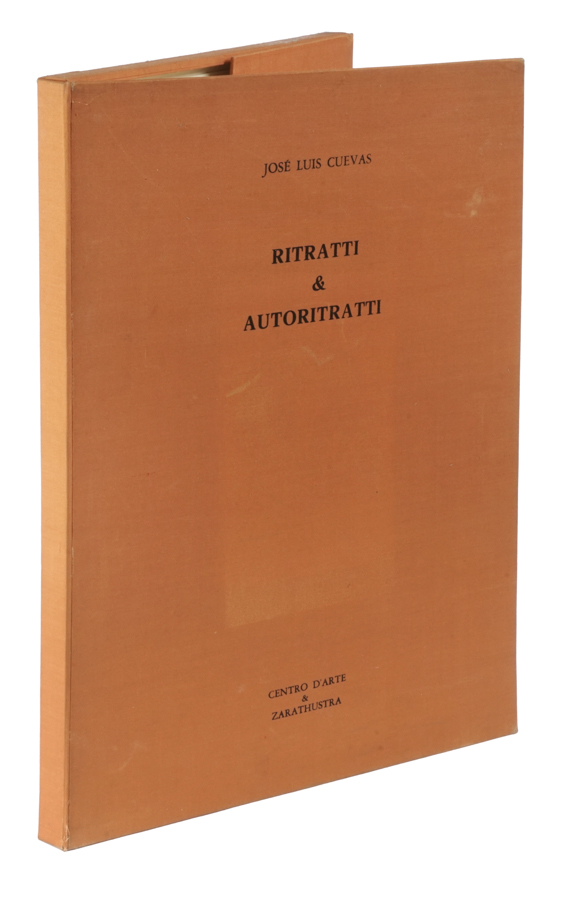 Cuevas José Luis, Ritratti & Autoritratti. Otto incisioni originali, testo di Roberto Sanesi. Milano: Centro D'Arte & Zarathustra, 1979. In-folio (mm 500x350). Carte [6] + 8 incisioni all'acquaforte acquatinta a colori di José Luis Cuevas, firmate e numerate a matita dall'Artista, sciolte e protette da velina. Ampie fioriture alle tavole, altrimenti buona copia. Cartella editoriale in piena tela con titoli al piatto. Uno dei 75 esemplari in cifre romane, su una tiratura complessiva di 110 copie. (1)Prima edizione.