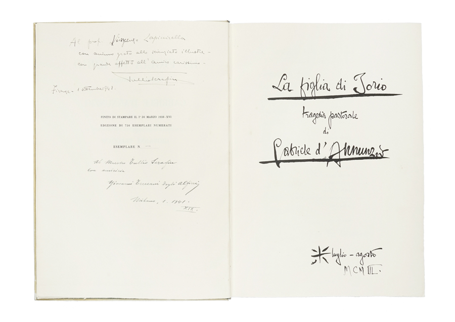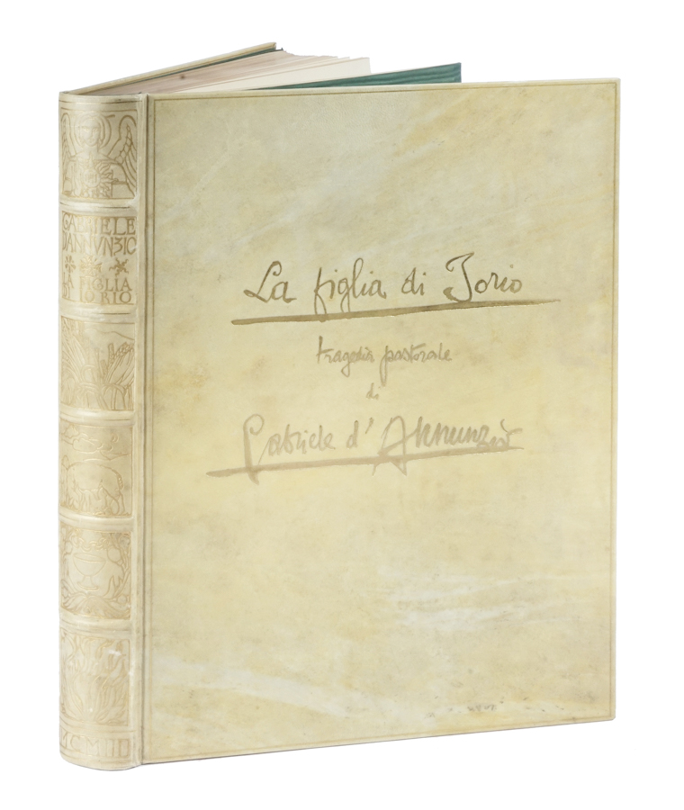 D'Annunzio Gabriele, La figlia di Iorio tragedia pastorale [...] riprodotta integralmente per mandato di Giovanni Treccani. Milano: Emilio Bestetti editore d'arte, 1938. In-folio (mm 345x250). Stato conservativo perfetto, in barbe. Esemplare di una tiratura a 750, copia non numerata e donata da Giovanni Treccani a Tullio Serafin (1941), quindi da Tullio Serafin a Lapiccirella (1943). Legatura originale in piena pergamena con titoli impressi in oro al piatto anteriore, decorazioni dorate ai comparti del dorso. Sguardie in seta verde con impressioni oro. Conservato entro custodia in carta decorata. (1)Cfr. Guabello 170.