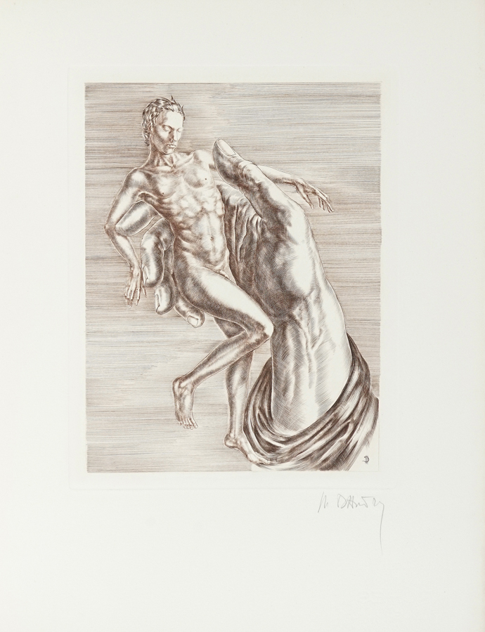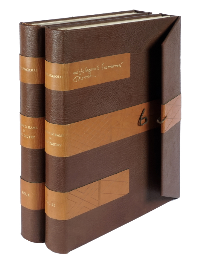 Dautry Marc, Michelangiolo Buonarroti. 17 incisioni in rame. Roma, Paris etc: ELDEC, 1975. 2 volumi in-folio (mm 430x320). Con, complessivamente, 17 belle incisioni fuori testo sciolte, firmate a matita da Marc Dautry e protette da velina. Ottimo stato conservativo. Legatura originale a busta in piena pelle con bande e titolo impresso in oro a piatto anteriore e dorso. Sguardie con riproduzione di manoscritto. Lacerti di legacci al primo volume. (2)