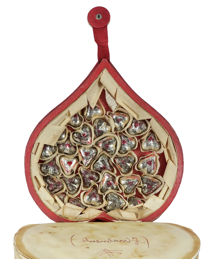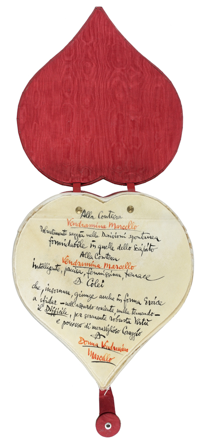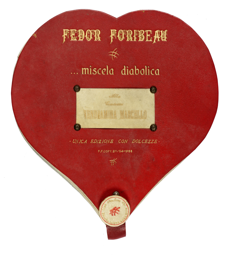 Foribeau Fedor, Miscela diabolica alla contessa Vendramina Marcello. Unica edizione con dolcezze. 1954-1955. Scatola in piena pelle rossa a forma di cuore (diam.: cm 30 ca.) con titoli in oro al piatto anteriore e su tassello in pergamena fissato con borchiette; il tutto, chiuso con fermaglio con impresso il motto "Non chiedere chi sono perché io non sono" e laccetto in pelle rossa. All'interno oltre 45 carte (in pergamena, cartoncino nero, carta rustica, stoffa etc...) manoscritte e illustrate e 29 cioccolatini a forma di cuore, rivestiti da carta argentata decorata a mano. Tracce di polvere ai piatti e altre minime mende, ma nel complesso ottima conservazione. (1)Curiosissima raccolta di poesie "da gustare" dedicate Contessa Vendramina Marcello, nobildonna veneziana.