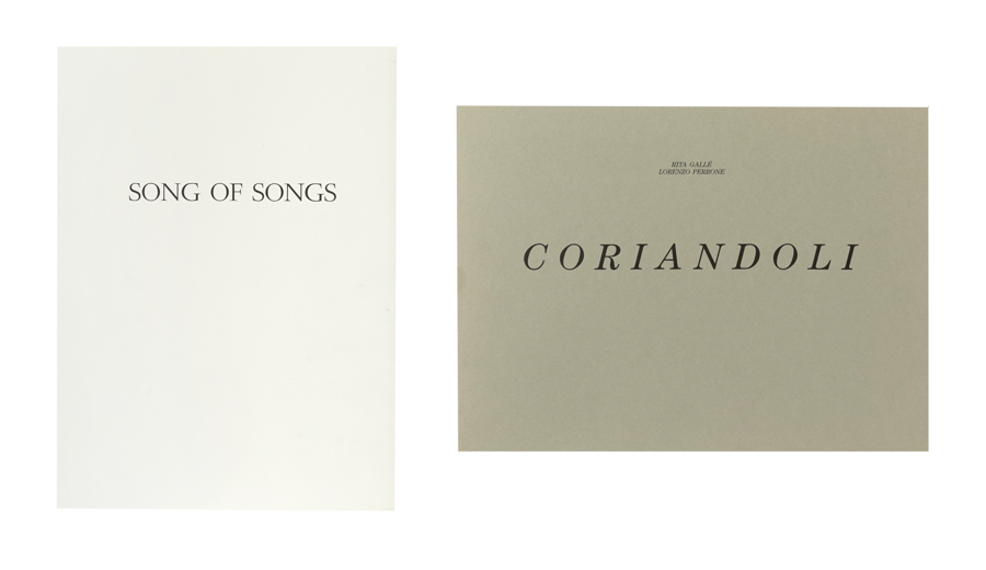 Gallé Rita, Song and Songs. Milano: Giorgio Upiglio, 1990. In-folio piccolo (mm 380x280). Con 4 incisioni all'acquatinta di Rita Gallé, di cui una a doppia pagina, tutte firmate a matita dall'Artista e protette da velina. Ottimo esemplare in barbe, a bifoli sciolti. Brossura editoriale con titoli in nero al piatto; entro cofanetto originale con titoli al dorso. Uno dei 100 esemplari in numeri arabi, su una tiratura complessiva di 110 copie. SI AGGIUNGE: Perrone Lorenzo, Coriandoli. Otto acquerelli e un'acquaforte di Rita Gallé. S.l.: Giorgio Upiglio, 1989. Con una bella acquaforte a colori, sciolta, di Rita Gallé, numerata, firmata e datata dall'Artista. (2)