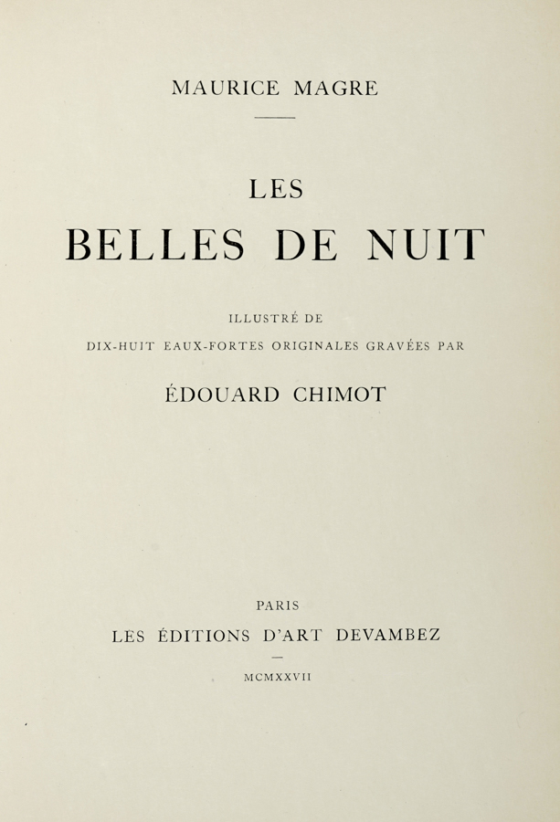 Magre Maurice, Les belles de nuit. Illustré de dix-huit eaux-fortes originale gravées par Édouard Chimot. Paris: Les Editions d'art Devambez, 1927.