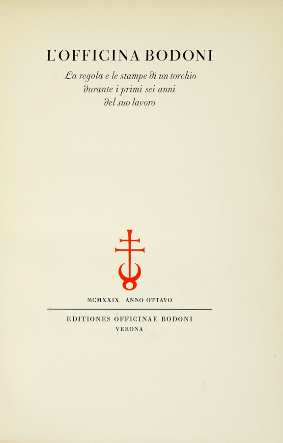 Mardersteig Giovanni, L'Officina Bodoni. La regola e le stampe di un torchio durante i primi sei anni del suo lavoro. Verona: Editiones Officinae Bodoni, 1929.