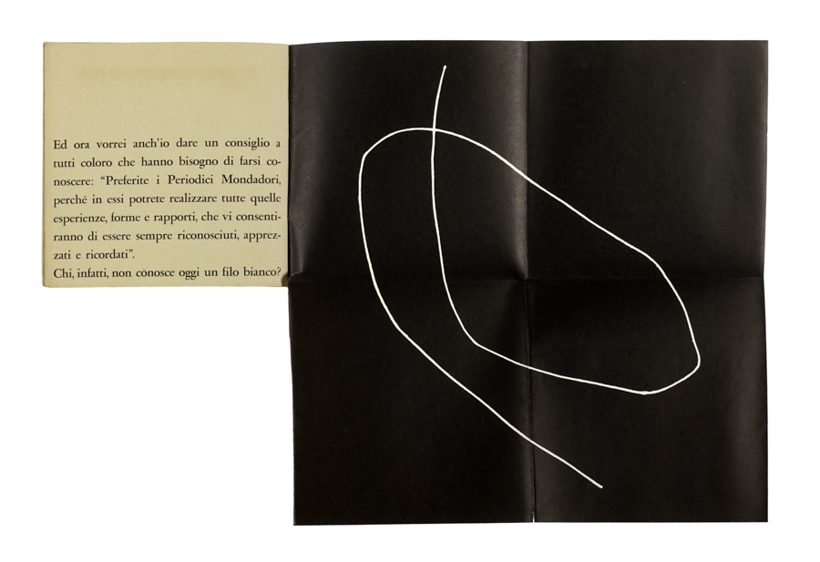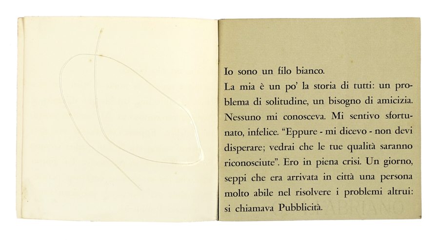 Munari Bruno, Storia di un filo. s.d.e. In-12° carré (mm 150x150). Carte di testo [6] su cartoncino grezzo, con 8 tavole stampate su carta nera o arancione, di cui una più volte ripiegata rilegata in fine, e 2 carte con interventi a mano dell'Artista (un filo bianco applicato al verso della prima e uno, entro plastica trasparente, al recto dell'altra). Minime tracce d'uso, ma nel complesso ottima copia. Brossura originale con titolo in arancione al piatto anteriore. Minimo ingiallimento del dorso e lievi tracce di foxing. (1)